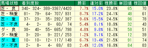 - ① 良馬場との比較:本当の鬼門は「稍重」!「重」「不良」でむしろ復活する