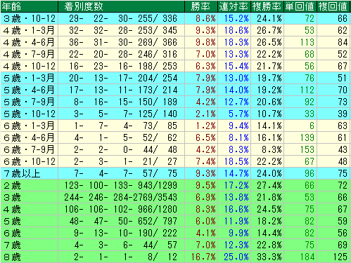 5歳以降は全体的にパフォーマンスが低下しますが、その中でも**5歳春(4-6月)**には単勝回収率112、**5歳夏(7-9月)**には単勝回収率92と、ピンポイントで妙味のある時期が存在します。