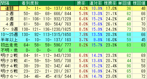 - 明け4戦目(単回96/複回58): 複勝率は平凡ですが、単勝回収率が最も高いのがこのタイミング。人気薄の一発に期待するなら、ここしかありません。