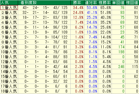 そして何よりも、人気馬の信頼度が非常に高いのが最大の特徴です。1番人気であれば高確率で馬券に絡み、2~3番人気でも安定した成績を残します。