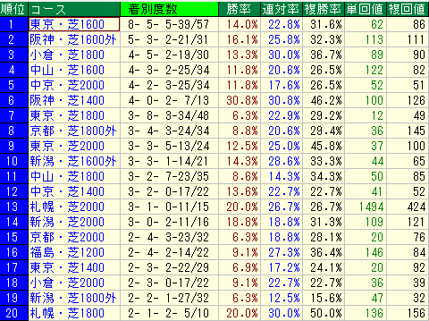 - 芝マイル: 重賞馬を出しているように、芝のマイル戦は勝率が最も高い距離です。