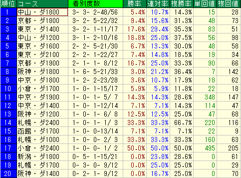 - 1番人気の3着内率: 74.1%をマークしており、1番人気に推された際には逆らわない方が賢明でしょう。