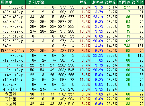 - ① 馬体重別で比べてみてどの馬体重が一番成績が良いか悪いか