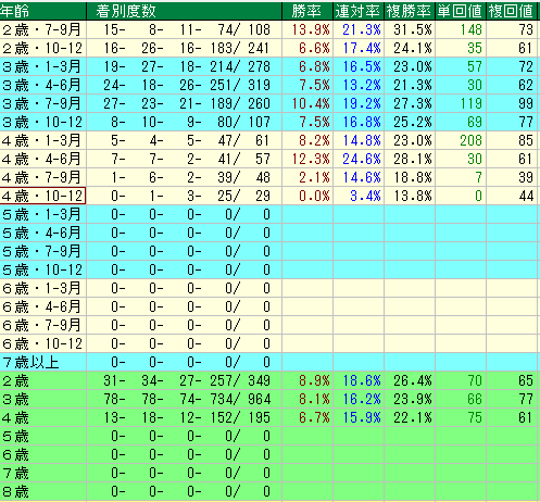 この産駒は、年齢別に見ると、2歳の夏から秋にかけて早くから頭角を現し、3歳の夏から秋にかけて本格化、そして4歳の春先に一発を秘めるタイプと言えるでしょう。特に4歳1-3月期に見せる驚異的な単勝回収値は、人気薄での大駆けを期待させる魅力的な傾向です。