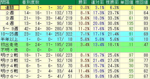 まずは、この産駒のレース間隔別成績を見ていきましょう。どの間隔で出走してきたときに狙い目なのか、馬券に直結する傾向を洗い出します。