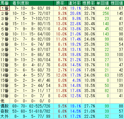 外番全体で見ると、14番と17番は得意としていますが、13番、15番、18番は苦手としています。特に15番と18番は勝率0.0%という厳しい成績です。全体として、外番は得意な馬番と苦手な馬番がはっきり分かれる傾向があります。