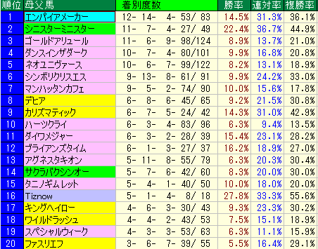 - 種牡馬データ(大外): 複勝率24.0%、単勝回収値103、複勝回収値79
