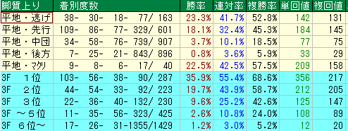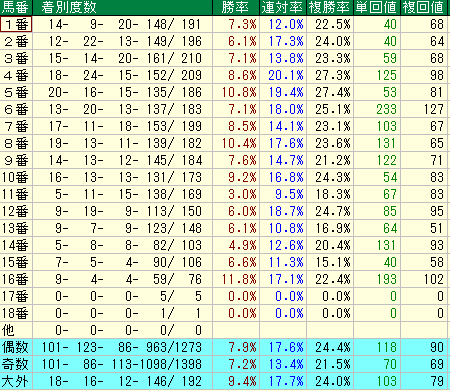 - 奇数番: 複勝率21.5%、単勝回収値70、複勝回収値69