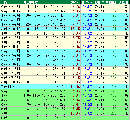 - 3歳全体では複勝率25.7%と全年齢区分で最も高い数値を誇ります。