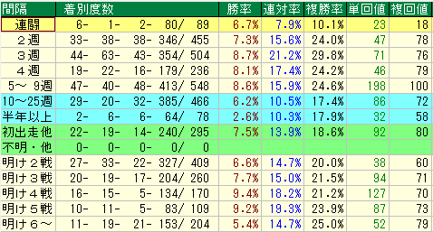 - 「10~25週(中長期休養明け)」: 複勝率17.4%、回収率も単勝86、複勝72と低い数値に留まっています。休養明け初戦は割引が必要です。