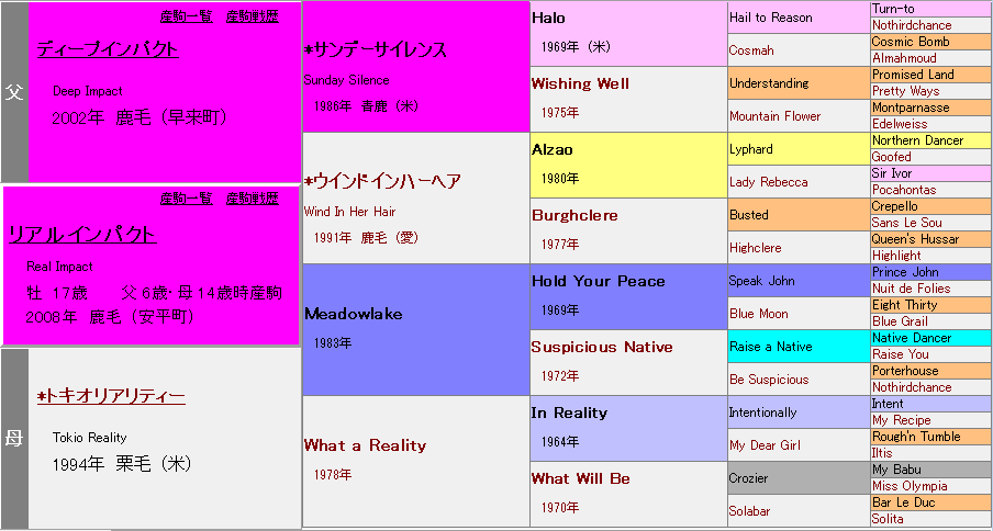 リアルインパクト産駒初のGI馬であり、種牡馬としてのリアルインパクトの評価を大きく高めた功労馬です。スピードと瞬発力を武器に、東京のマイル戦で最高の輝きを放ちました。父同様、マイル路線での活躍はリアルインパクト産駒の「王道」と言えるでしょう。