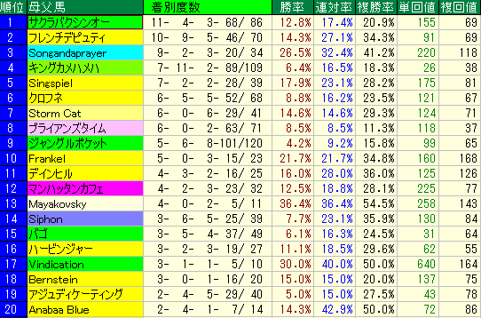 - 10番: **複勝率26.0%**は種牡馬データで最も高く、平均の21.0%を大きく上回ります。複勝回収値も90と優秀。