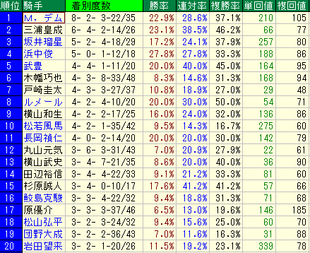 - 複勝回収値: 13番(72)、14番(41)、15番(109)、16番(49)、17番(60)、18番(34)