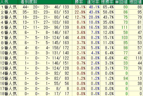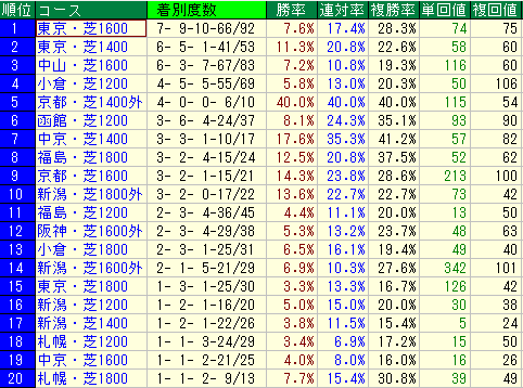 結論:外枠は苦手な馬番が多いが、15番、16番、18番では平均を上回る複勝率と高い回収率を記録しており、特に15番は穴狙いとして注目に値する。
