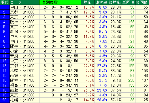 - その中でも特に「京都ダート」は絶好の狙い目! 勝率15%は非常に高く、馬単や1着固定の軸として積極的に狙ってみましょう。 特に上位人気に推されている場合は、信頼度がさらに高まります。
