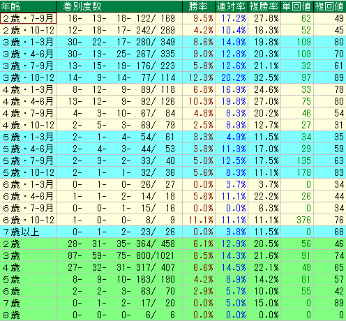 - 半年以上:勝率11.1%、連対率13.0%、複勝率16.7%、単勝回収値77、複勝回収値39