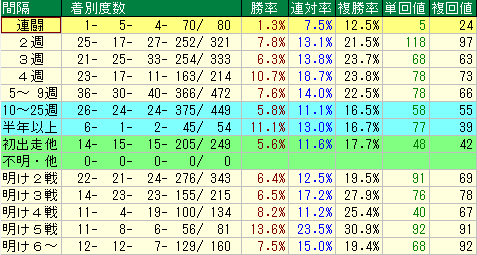 - コメント: 4週間隔で、最も高い勝率と連対率を記録しています。この間隔も得意なローテーションであり、積極的に狙っていきたい条件です。