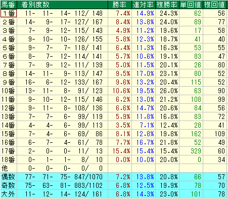 - 中番(5~12番): 得意な馬番と苦手な馬番がはっきり分かれる。特に10番、8番、11番、7番は得意。