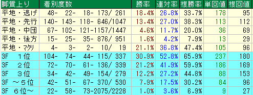 - 短距離から中距離(~2000m)までは芝・ダート問わず、まんべんなく勝利を挙げ、連対率・3着内率も安定。