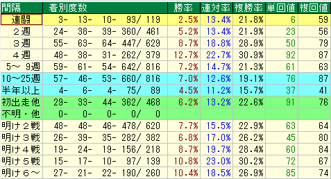 - 10~25週: 複勝率19.1%と低めですが、複勝回収値87と高め。人気薄の休み明けに穴を狙うならこの期間です。