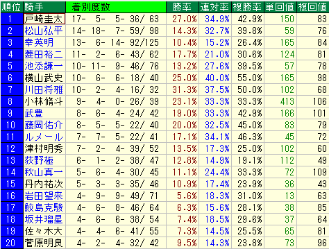 - 勝率6.8%、連対率17.0%、複勝率26.2%。単勝回収値45、複勝回収値80。