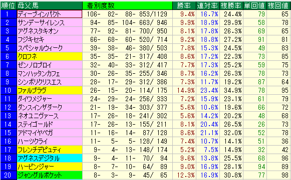 上記の計算上、外枠も平均を上回っているように見えますが、これは種牡馬データ全体の複勝率が高い(全体の複勝率が約24%と、平均的な馬より走る産駒である)ためです。