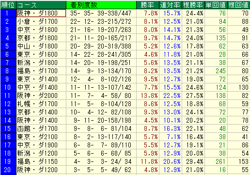 - 13番~18番の全ての枠で平均を下回るか、ほぼ同等の苦手な枠です。
