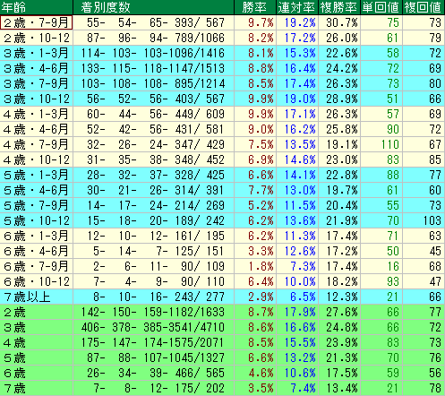 全体的に低調な中で、**4歳夏(7-9月)**の単勝回収率110、**4歳秋(10-12月)**の複勝回収率85、**5歳秋(10-12月)**の複勝回収率103など、ピンポイントで妙味のある時期が存在します。