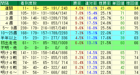- 半年以上(単回39/複回63): パフォーマンス、回収率ともに低く、馬券的な期待値は皆無。長期休み明けの馬は、問句無用で「消し」で良いでしょう。