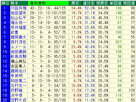 こちらも単勝回収率109と妙味たっぷり。複勝率は30.9%ですが、ベテランらしい渋い騎乗で穴馬を馬券内に持ってきます。