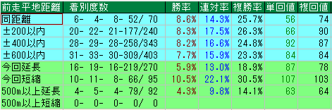 平均と同様の成績だが、±200m以内では回収率が高いため、微妙な距離変化にも強い馬を狙うと良い。