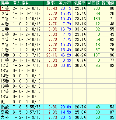- 内枠(1~4番): 1番枠の単勝回収率が208と高く、侮れません。全体的にも悪くなく、有利なゾーンと言えます。