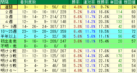- **「連闘」**は、複勝率9.7%、単勝回収値28、複勝回収値24と、馬券的妙味はほとんどありません。見送りが賢明です。