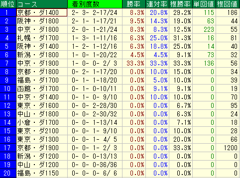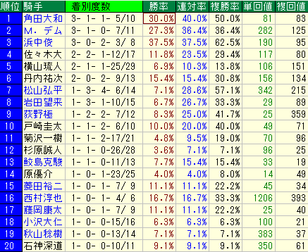 - データ: 複勝率 42.1% / 単勝回収値 72 / 複勝回収値 64