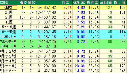 - 勝率 5.5%、複勝率 15.9%。最も勝ち星(10勝)を挙げているのがこの間隔。使いつつ調子を維持できるタフさが証明されています。