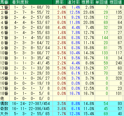 - 数値上は高いですが、1番・3番の不振が目立ちます。内枠なら「偶数番」であることが絶対条件です。