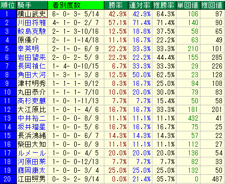 - データ: 複勝率 28.1% / 複勝回収値 161