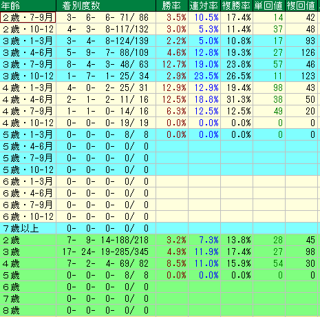 - 理由: 4歳1-3月の勝率12.9%、4-6月の複勝率31.3%。
