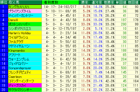- 第5位:キングカメハメハ 複勝率25.3%、複勝回収値90。 分母となる出走数が217と最多ながら、高い複勝率と平均以上の回収率を維持しています。王道配合でありながら、馬券的な妙味も損なわれていない「安定と信頼」のコンビです。