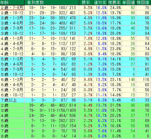 - 複勝率は17%〜19%台で安定はしていますが、特筆すべきは単勝回収値の低さ。特に3歳1−3月は33、7−9月は40と壊滅的です。人気を背負って取りこぼすシーンが目立ち、馬券的には「期待されすぎて妙味がない」時期と言えます。