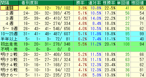 1.間隔別パフォーマンス:休み明けの「フレッシュさ」が最大の武器