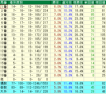 - 特注馬番:6番(25.3%)、8番(26.2%)