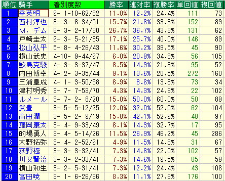 - 第2位:ウォーエンブレム 複勝率25.0%、単勝回収値204。 複勝率は4回に1回と悪くない数値ながら、勝った時の配当が凄まじいコンビ。母父の気難しさが、菅原騎手の強気な騎乗とマッチした時に高配当を運んできます。