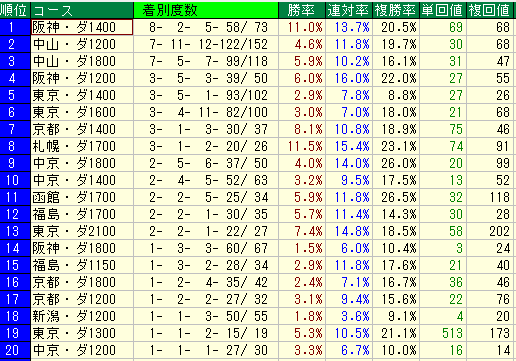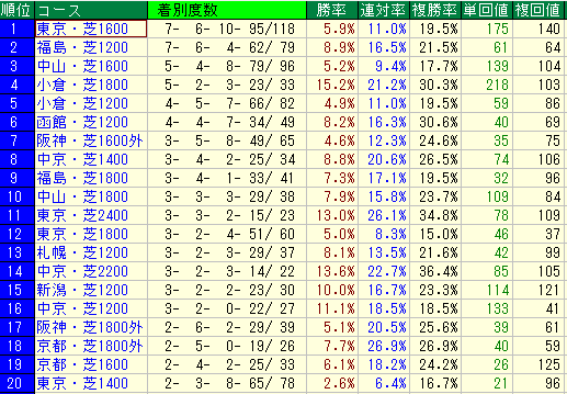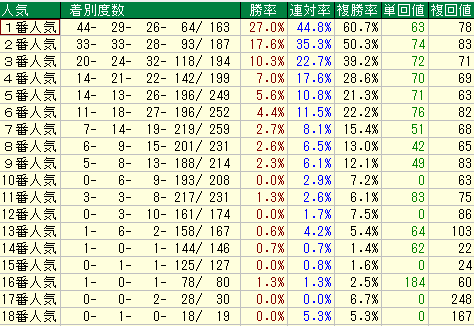 - 複勝率は14.1%と低いものの、単勝回収値は驚愕の163!人気を完全に落とした実力馬が、年明け一発目に激走するケースが多発しています。