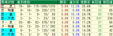 - 解説: 平均的な大外枠の複勝率よりも6%も低いという厳しい結果が出ています。回収値「48」という数字は、大外枠に入ったブリランテ産駒を追いかけ続けても資金が半分以下になることを意味します。先行してしぶとさを活かしたいこの産駒にとって、大外枠の不利は致命的。人気でもバッサリ切る勇気が必要です。