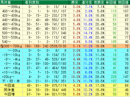 - 確実性を取るなら「460kg〜539kg」を軸に据えよ! このレンジをキープできている馬は、複勝率が安定して**20%**を超えます。
