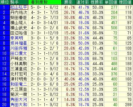 • 中団:【得意】 複勝率24.3%(平均20.3%)、勝率8.8%(平均5.8%)。「中団から差す」競馬でも平均以上の強さを見せ、単勝回収値93と、人気薄の差し切りも期待できます。