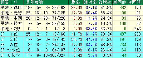 • 上がり6位以下:【前を得意とする粘り】 注目すべきは上がり6位以下の数字です。複勝率8.3%(平均7.5%)、勝率3.4%(平均1.6%)、単勝回収値44、複勝回収値33。いずれも平均値を上回っており、**「末脚が不発でも前で粘り切れる」**強さを持っています。このため、先行集団にいる際は上がりの順位に関わらず警戒が必要です。