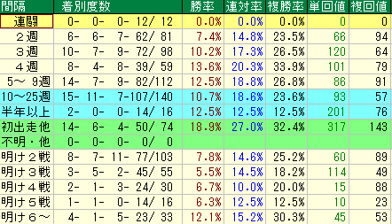 • 【再点火:明け6戦目〜】 面白いのは明け6戦目以降で勝率12.1%、複勝率**30.3%**と再浮上すること。これは使い込みながらもタフに走り続けるタイプか、あるいはクラス慣れして浮上してくるケースを示唆していますが、基本的には「フレッシュな時期」を狙うのが定石です。
