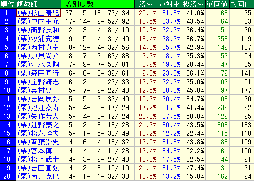 勝率、回収率、安定感のすべてがハイレベルな、西村騎手の「勝負鞍」を任される精鋭厩舎たちです。
